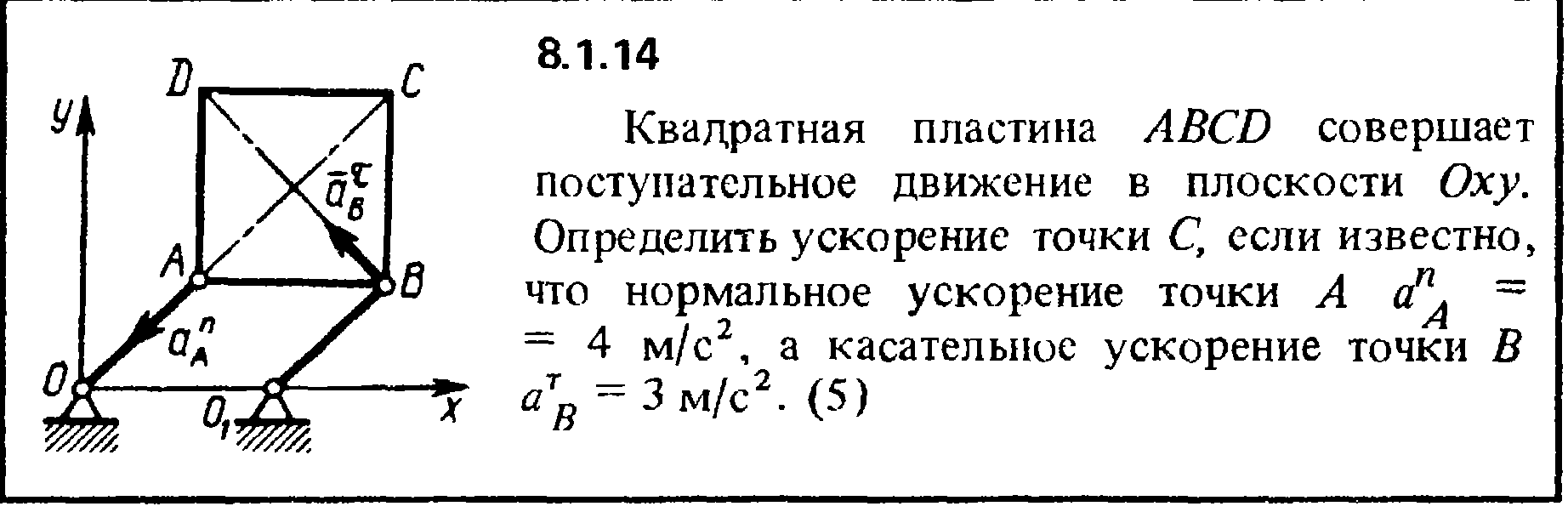 Квадратная пластина ABCD совершает поступательное движение в плоскости Оху. Определить ускорение точки С, если известно, что нормальное ускорение точки А аnA = 4 м/с2, а касательное ускорение точки В aτB = 3 м/с2.