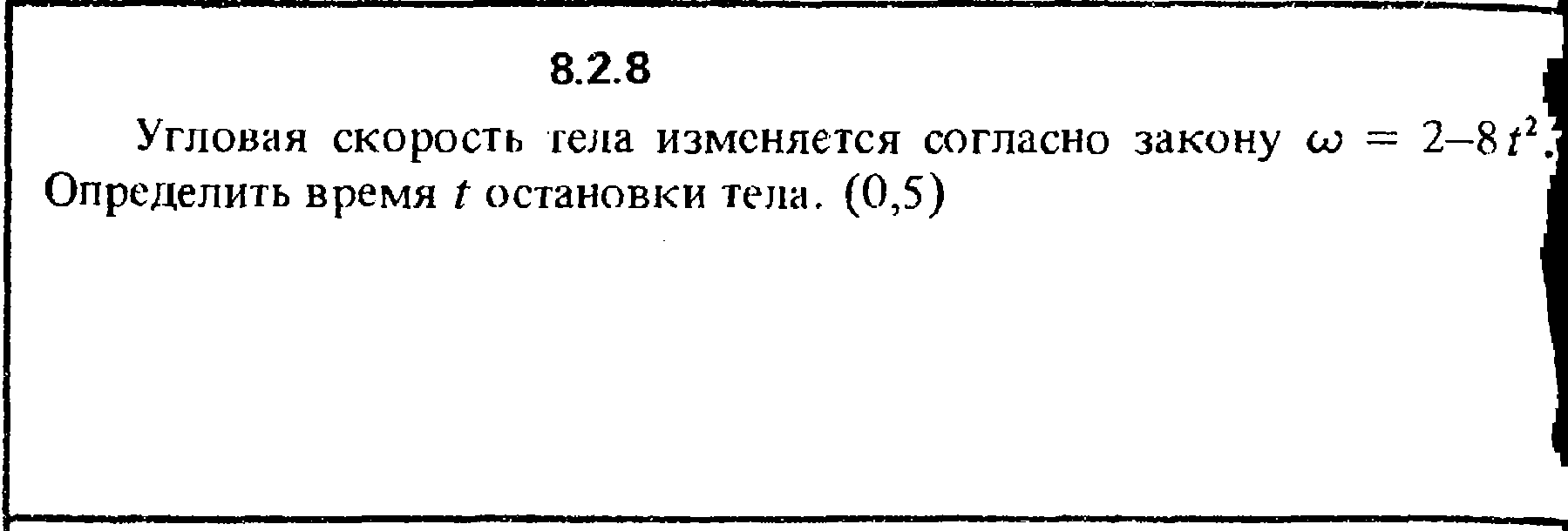 Угловая скорость тела изменяется согласно закону ω = 2 - 8t2. Определить время t остановки тела.