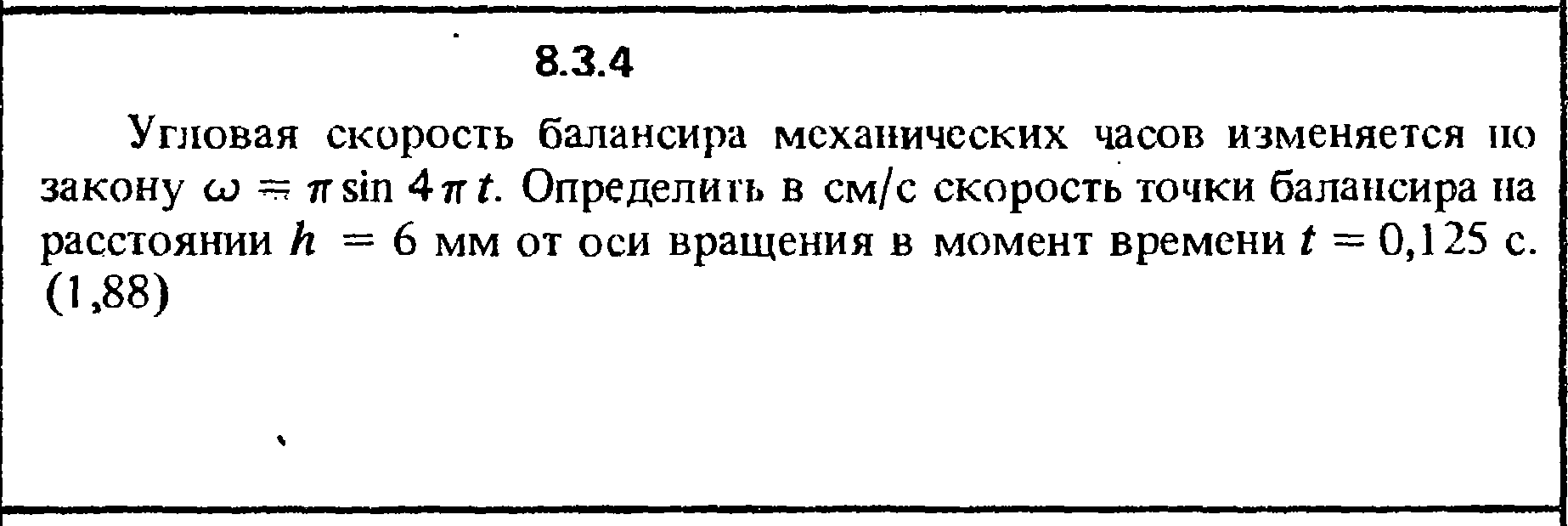 Угловая скорость балансира механических часов изменяется по закону ω = πsin4πt. Определить в см/с скорость точки балансира на расстоянии h = 6 мм от оси вращения в момент времени t = 0,125 с.