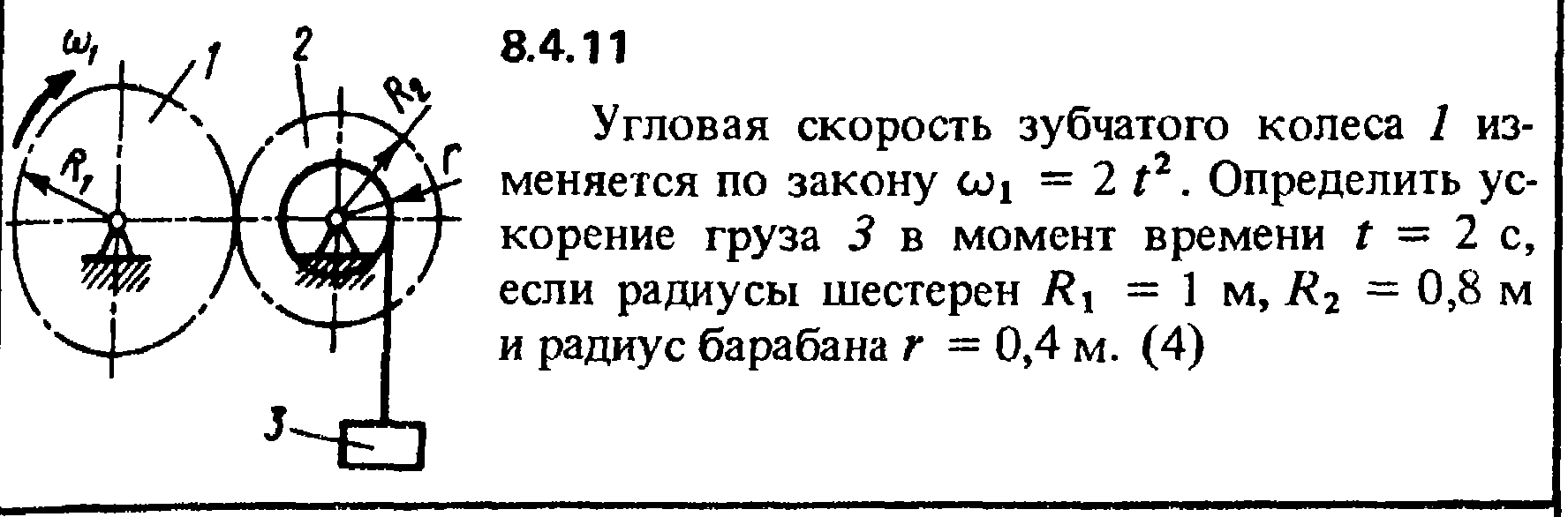 Угловая скорость зубчатого колеса 1 именяется по закону ω1 = 2t2. Определить ускорение груза 3 в момент времени t = 2 с, если радиусы шестерен R1 = 1 м, R2 = 0,8 м и радиус барабана r = 0,4 м.