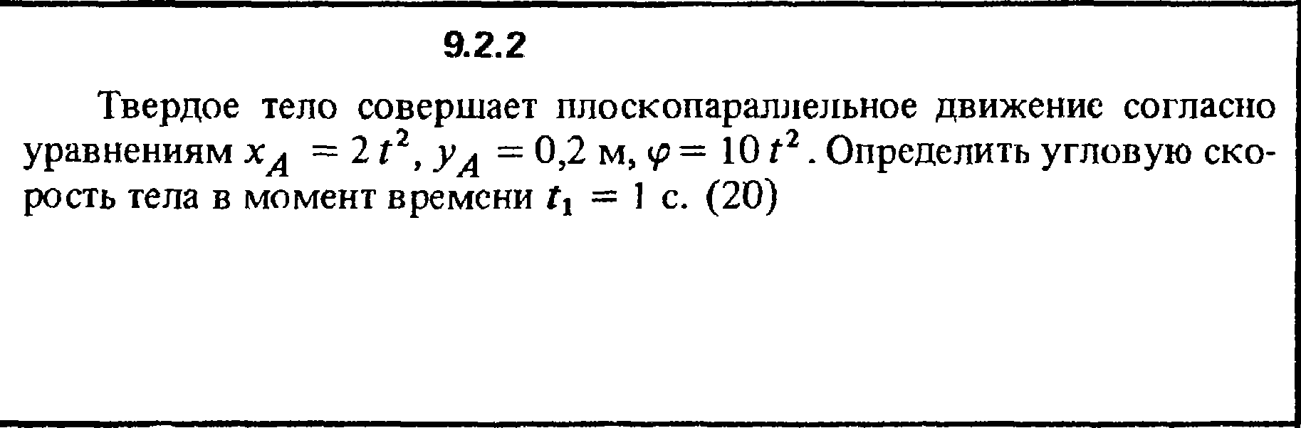 Твердое тело совершает плоскопараллельное движение согласно уравнениям хА = 2t2, уА = 0,2 м, φ = 10t2. Определить угловую скорость тела в момент времени t1 = 1 с.