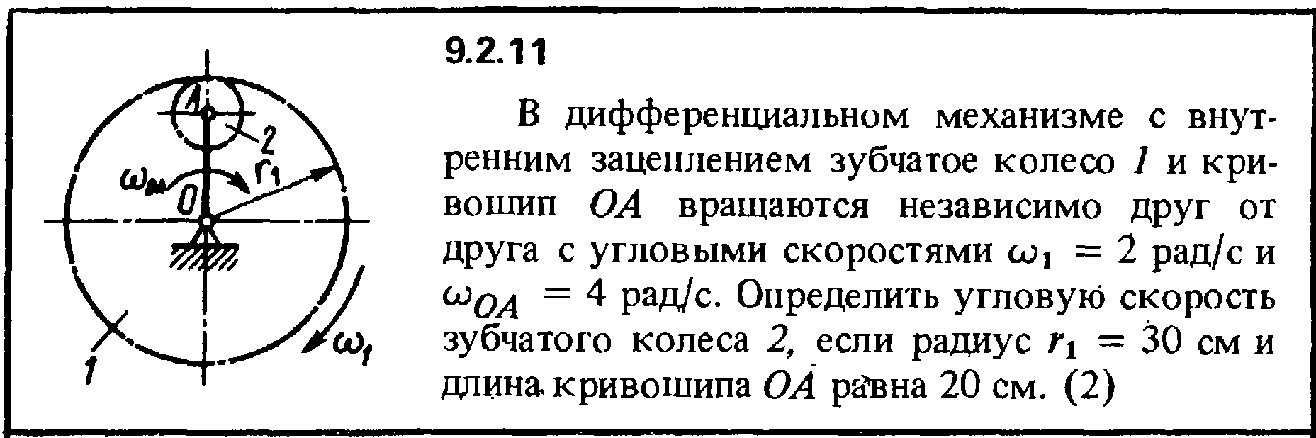 В дифференциальном механизме с внутренним зацеплением зубчатое колесо 1 и кривошип ОА вращаются независимо друг от друга с угловыми скоростями ω1 = 2 рад/с и ωOA = 4 рад/с. Определить угловую скорость зубчатого колеса 2, если радиус r1 = 30 см и длина кривошипа OA равна 20 см.