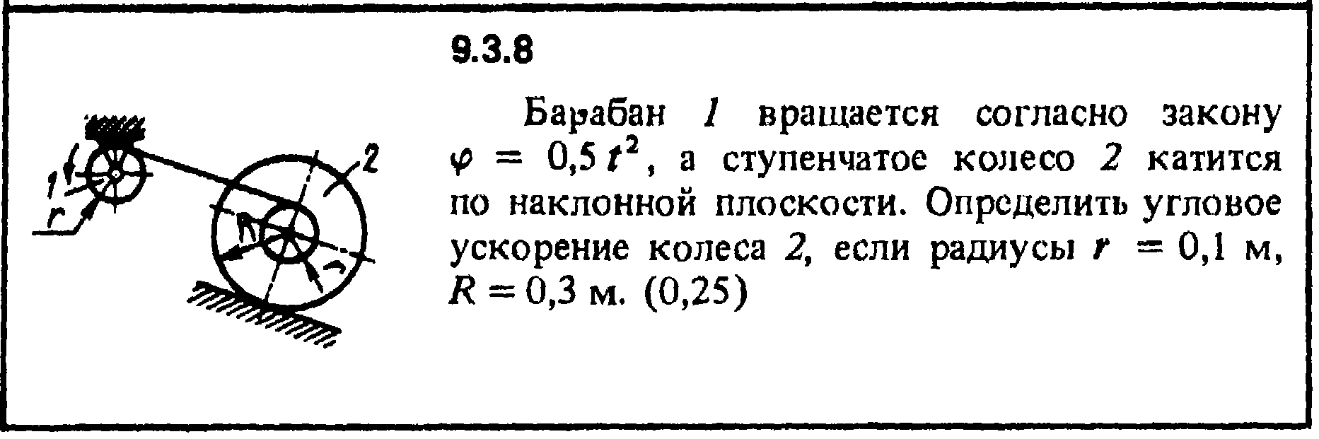 Барабан 1 вращается согласно закону φ = 0,5t2, а ступенчатое колесо 2 катится по наклонной плоскости. Определить угловое ускорение колеса 2, если радиусы r = 0,1 м, R = 0,3 м.