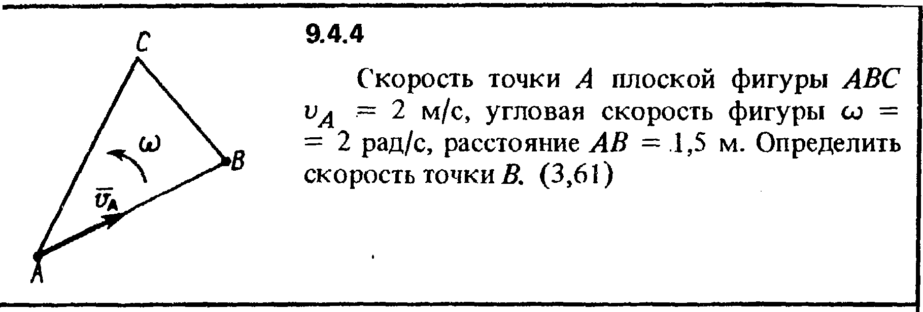 Скорость точки А плоской фигуры АВС vA = 2 м/с, угловая скорость фигуры ω = 2 рад/с, расстояние АВ = 1,5 м. Определить скорость точки В.