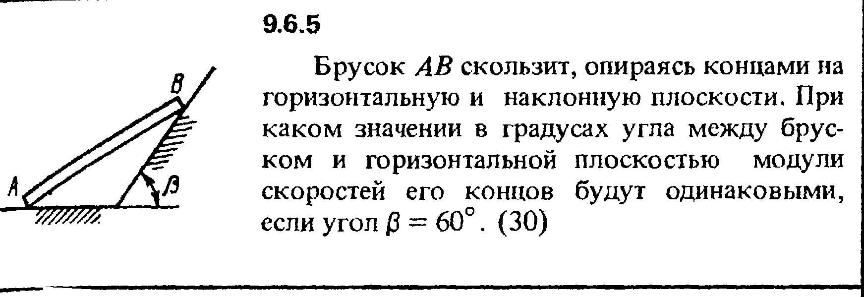 9.6.5 Брусок АВ скользит, опираясь концами на горизонтальную и наклонную плоскости. При каком значении в градусах угла между бруском и горизонтальной плоскостью модули скоростей его концов будут одинаковыми, если угол β = 60°.