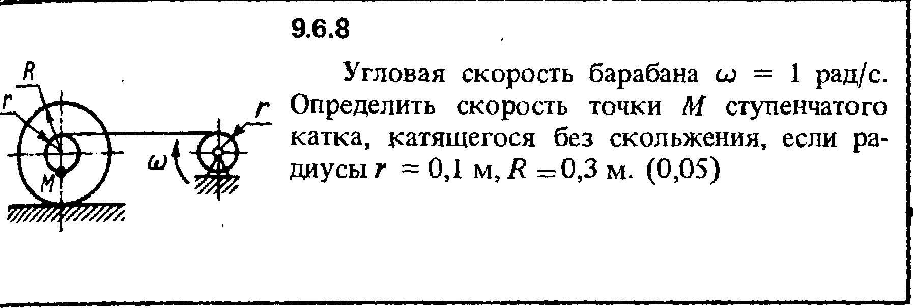 9.6.8 Угловая скорость барабана ω = 1 рад/с. Определить скорость точки М ступенчатого катка, катящегося без скольжения, если радиусы r = 0,1 м, R =0,3 м.