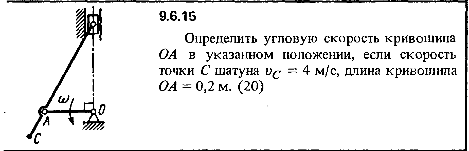 Определить угловую скорость кривошипа ОА в указанном положении, если скорость точки С шатуна vC = 4 м/с, длина кривошипа ОА = 0,2 м.