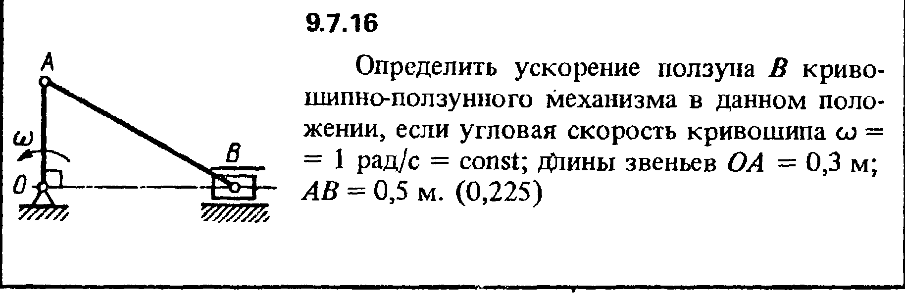 Определить ускорение ползуна В кривошипно-ползунного механизма в данном положении, если угловая скорость кривошипа ω = 1 рад/с = const; длины звеньев ОА = 0,3 м; АВ = 0,5 м.
