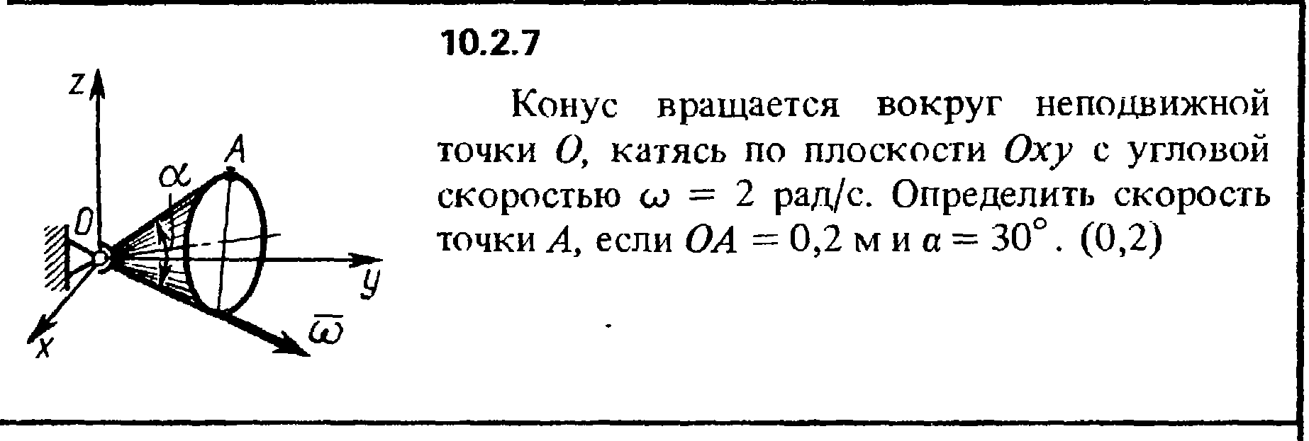 10.2.7 Конус вращается вокруг неподвижной точки О, катясь по плоскости Оху с угловой скоростью ω = 2 рад/с. Определить скорость точки А, если ОА = 0,2 м и α = 30°.