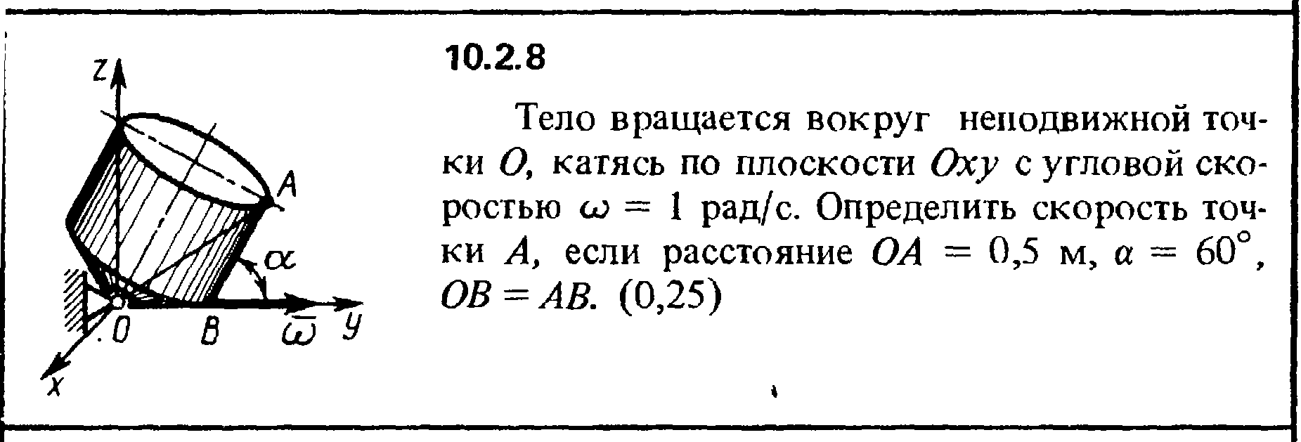 10.2.8 Тело вращается вокруг неподвижной точки О, катясь по плоскости Оху с угловой скоростью ω = 1 рад/с. Определить скорость точки А, если расстояние ОА = 0,5 м, a = 60°, ОВ = АВ.