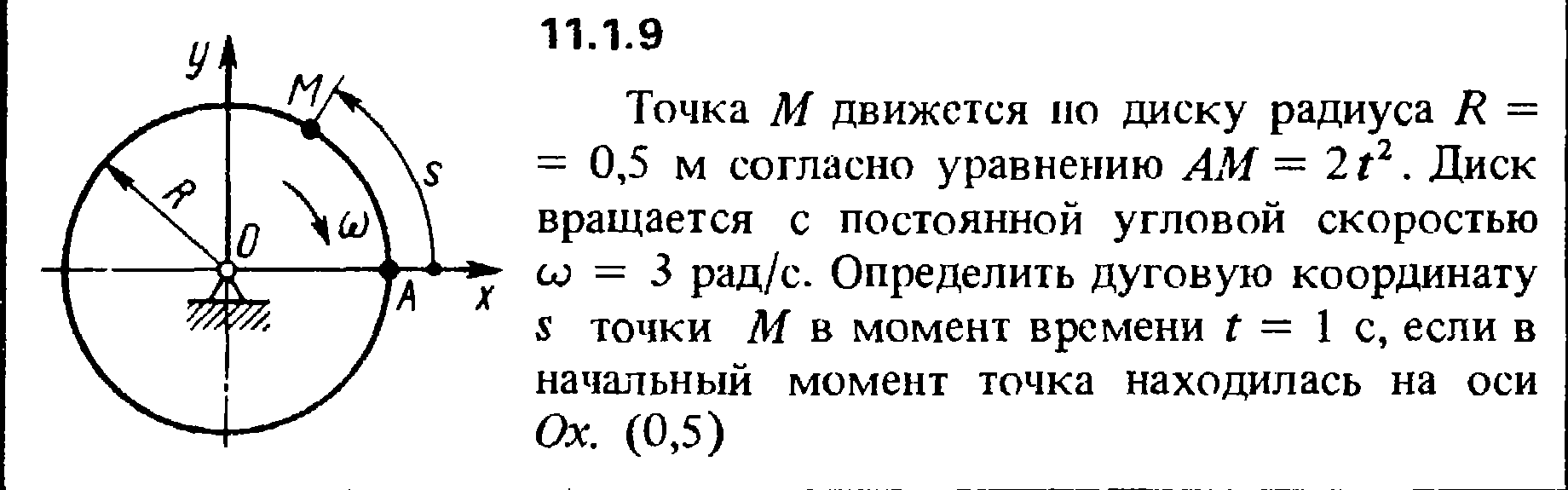 Точка М движется по диску радиуса R = 0,5 м согласно уравнению AM = 2t2. Диск вращается с постоянной угловой скоростью ω = 3 рад/с. Определить дуговую координату s точки М в момент времени t = 1 с, если в начальный момент точка находилась на оси Ох.