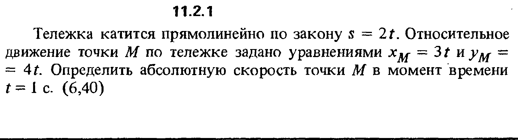 11.2.1 Тележка катится прямолинейно по закону s = 2t. Относительное движение точки М по тележке задано уравнениями хM = 3t и yM = 4t. Определить абсолютную скорость точки М в момент времени t = 1 с.