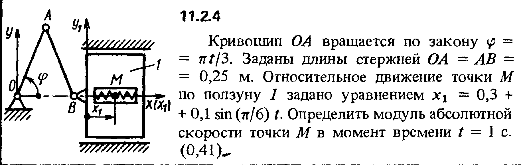 11.2.4 Кривошип ОА вращается по закону φ = πt/3. Заданы длины стержней ОА = АВ = 0,25 м. Относительное движение точки М по ползуну 1 задано уравнением x1 = 0,3 + 0,1sin(π/6)t. Определить модуль абсолютной скорости точки М в момент времени t = 1 с.