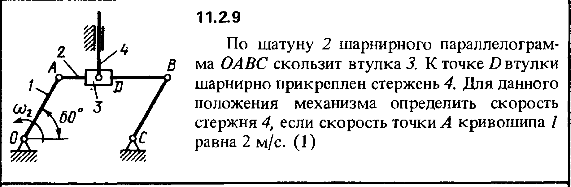 11.2.9 По шатуну 2 шарнирного параллелограмма ОАВС скользит втулка 3. К точке D втулки шарнирно прикреплен стержень 4. Для данного положения механизма определить скорость стержня 4, если скорость точки А кривошипа 1 равна 2 м/с.