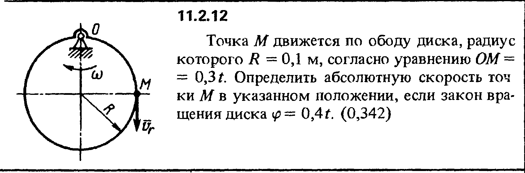 11.2.12 Точка М движется по ободу диска, радиус которого R = 0,1 м, согласно уравнению ОМ = 0,3t. Определить абсолютную скорость точки М в указанном положении, если закон вращения диска φ = 0,4t.