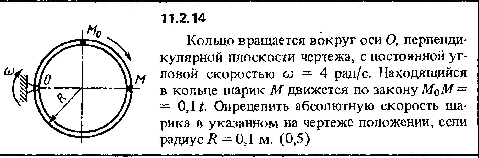 11.2.14 Кольцо вращается вокруг оси О, перпендикулярной плоскости чертежа, с постоянной угловой скоростью ω = 4 рад/с. Находящийся в кольце шарик М движется по закону М0М = 0,1t. Определить абсолютную скорость шарика в указанном на чертеже положении, если радиус R = 0,1 м.