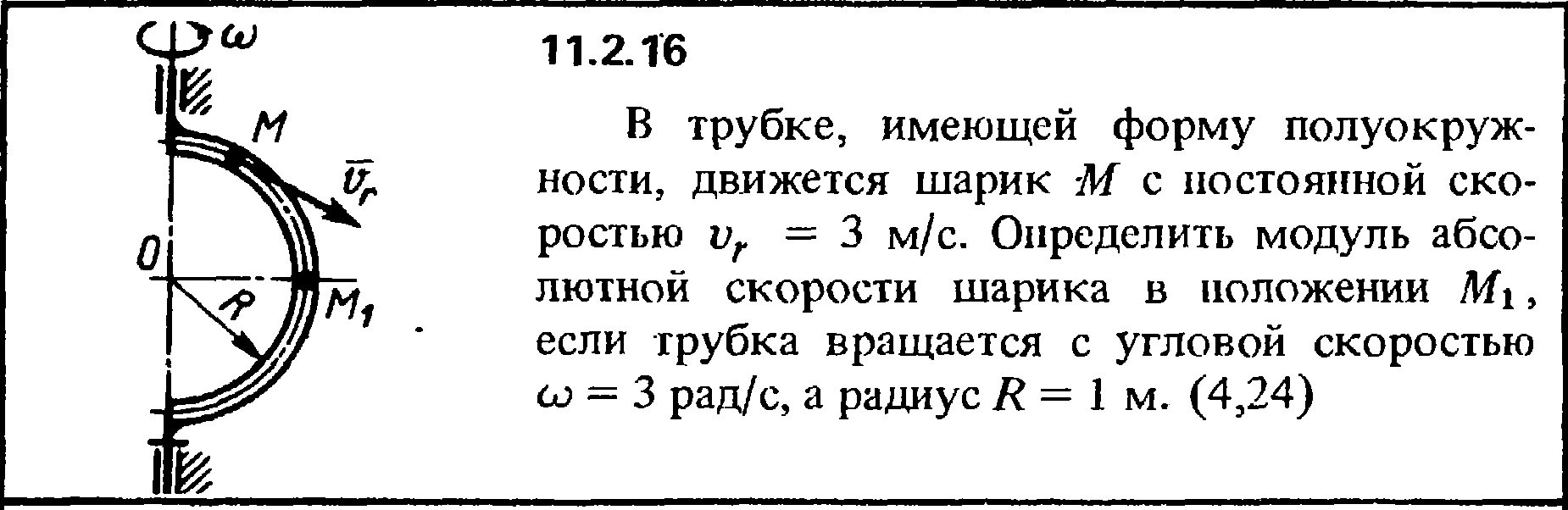 В трубке, имеющей форму полуокружности, движется шарик М с постоянной скоростью vr = 3 м/с. Определить модуль абсолютной скорости шарика в положении M1, если трубка вращается с угловой скоростью ω = 3 рад/с, а радиус R = 1 м.