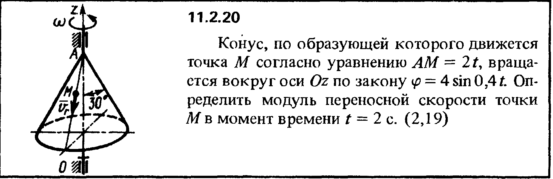 Конус, по образующей которого движется точка М согласно уравнению AM = 2t, вращается вокруг оси Oz по закону φ = 4sin0,4t. Определить модуль переносной скорости точки М в момент времени t = 2 с.