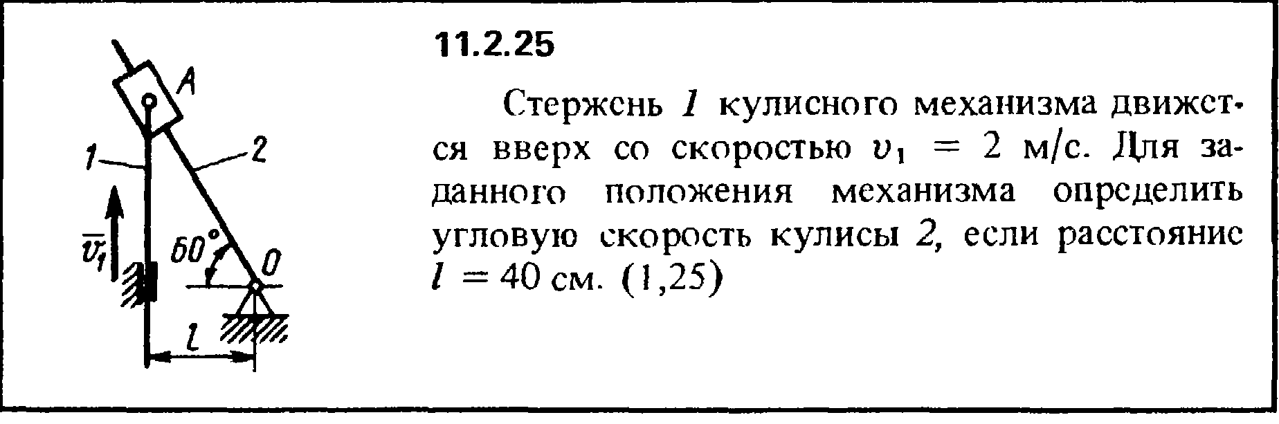 11.2.25 Стержень 1 кулисного механизма движется вверх со скоростью v = 2 м/с. Для заданного положения механизма определить угловую скорость кулисы 2, если расстояние l =40 см.