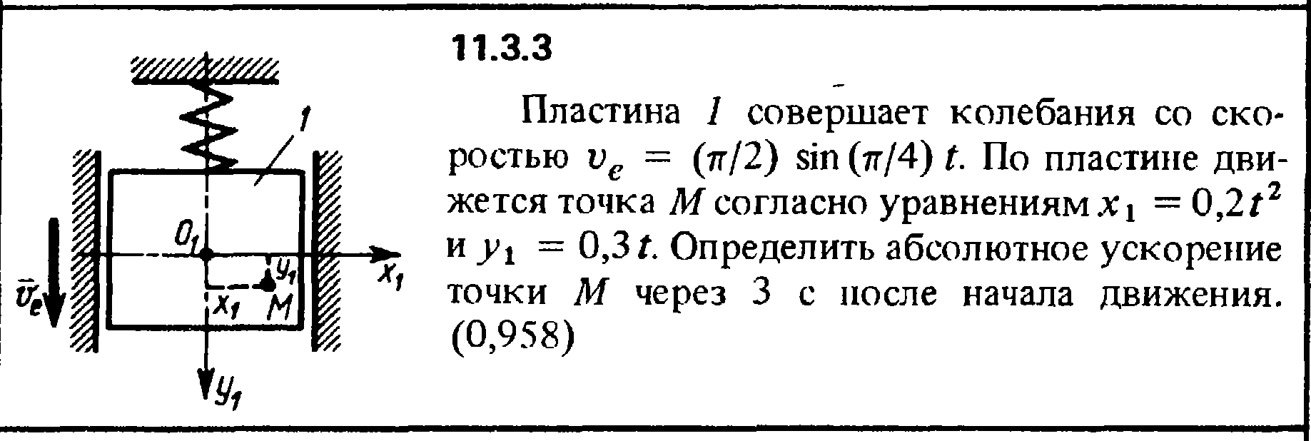 Пластина 1 совершает колебания со скоростью ve = (π/2)sin(π/4)t. По пластине движется точка М согласно уравнениям x1 = 0,2t2 и y1 = 0,3t. Определить абсолютное ускорение точки М через 3 с после начала движения.