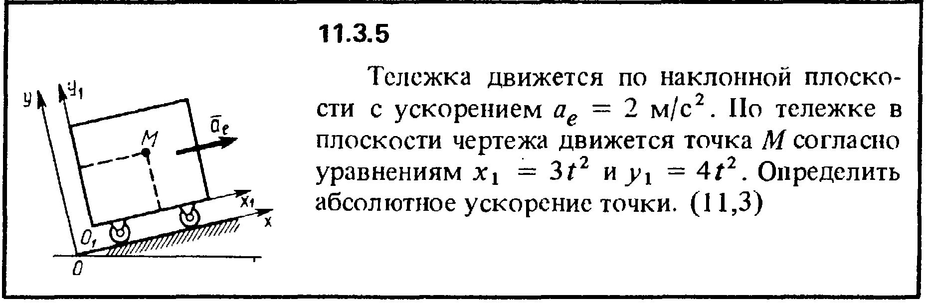 11.3.5 Тележка движется по наклонной плоскости с ускорением ае = 2 м/с2. По тележке в плоскости чертежа движется точка М согласно уравнениям x1 = 3t2 и y1 = 4t2. Определить абсолютное ускорение точки.