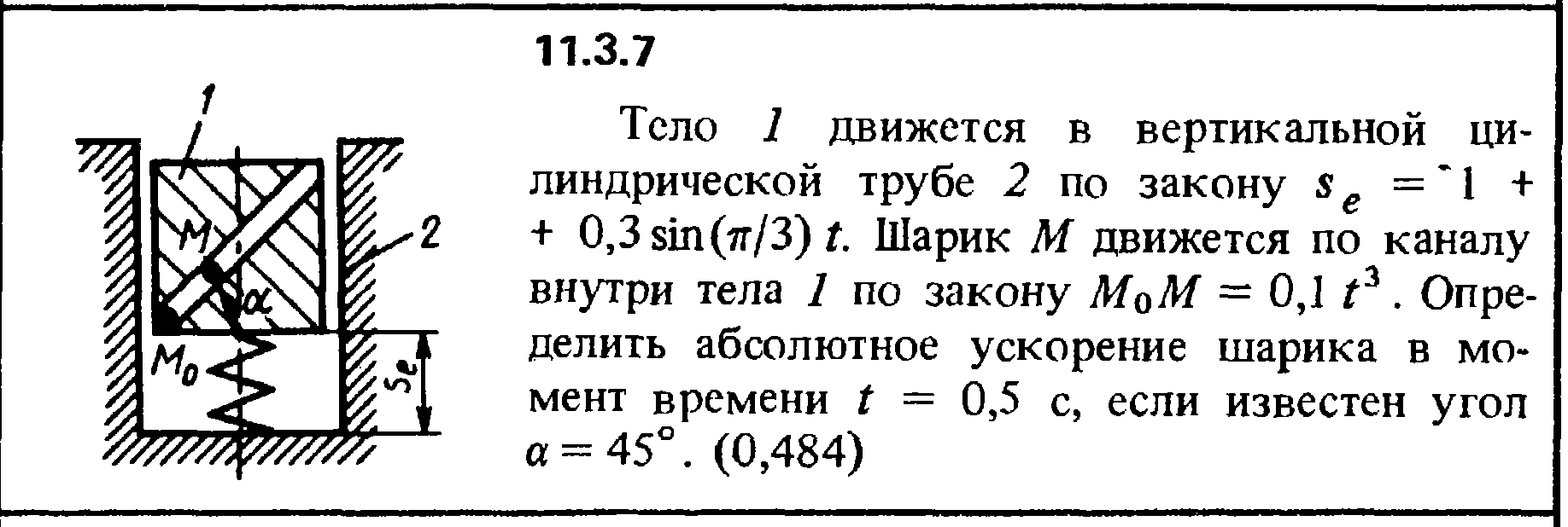 11.3.7 Тело 1 движется в вертикальной цилиндрической трубе 2 по закону se = 1 + 0,3sin(π/3)t. Шарик М движется по каналу внутри тела 1 по закону М0М = 0,1t3 . Определить абсолютное ускорение шарика в момент времени t = 0,5 с, если известен угол а = 45°.