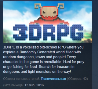 3DRPG is a voxelized old-school RPG where you explore a Randomly Generated world filled with random dungeons, towns and people! Every character in the game is recruitable. Hunt for prey or go fishing for food. Search for treasure in dungeons and fight monsters on the way!