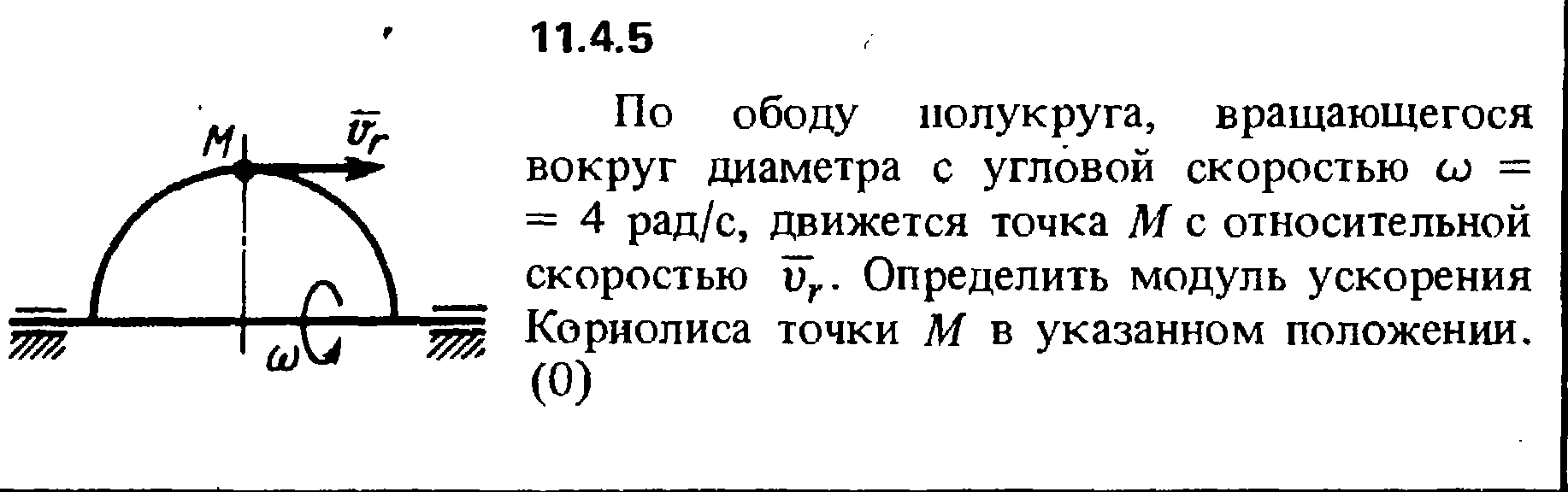 По ободу полукруга, вращающегося вокруг диаметра с угловой скоростью ω = 4 рад/с, движется точка М с относительной скоростью vr. Определить модуль ускорения Кориолиса точки М в указанном положении.