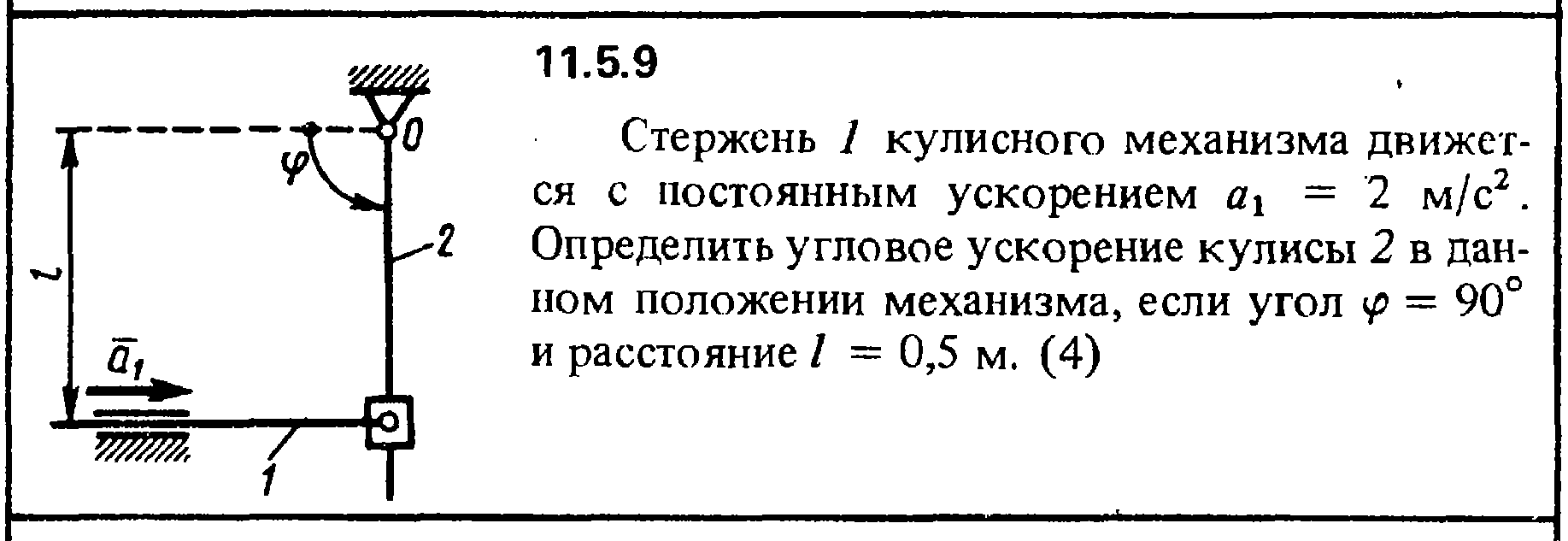 11.5.9 Стержень 1 кулисного механизма движется с постоянным ускорением a1 = 2 м/с2. Определить угловое ускорение кулисы 2 в данном положении механизма, если угол φ = 90° и расстояние l = 0,5 м