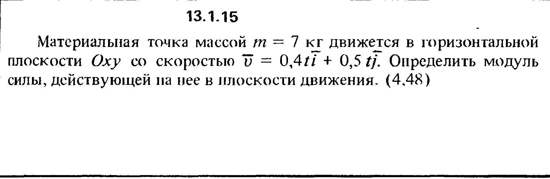 Материальная точка массой m = 7 кг движется в горизонтальной плоскости Оху со скоростью v = 0,4ti + 0,5tj. Определить модуль силы, действующей на нее в плоскости движения.