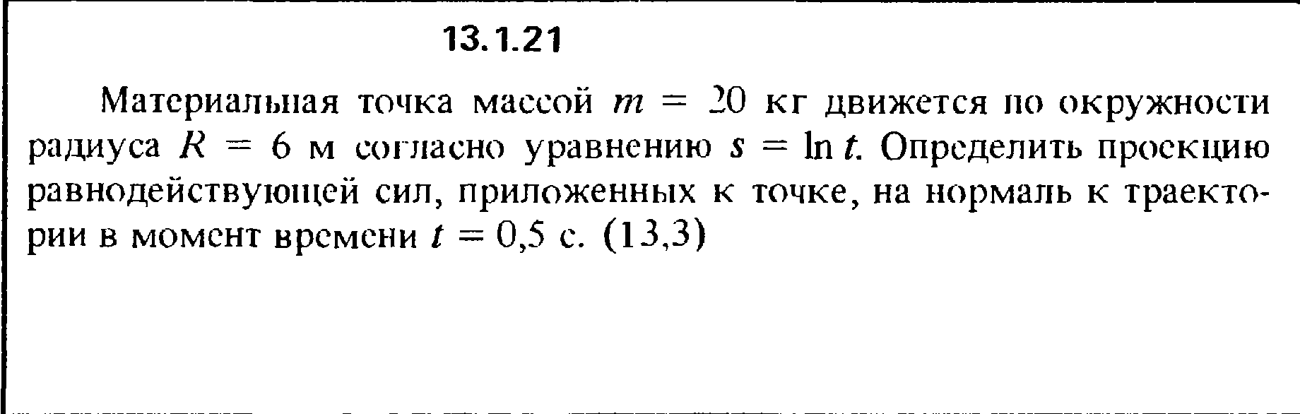 Материальная точка массой m = 20 кг движется по окружности радиуса R = 6 м согласно уравнению s = lnt. Определить проекцию равнодействующей сил, приложенных к точке, на нормаль к траекто­рии в момент времени t = 0,5 с.