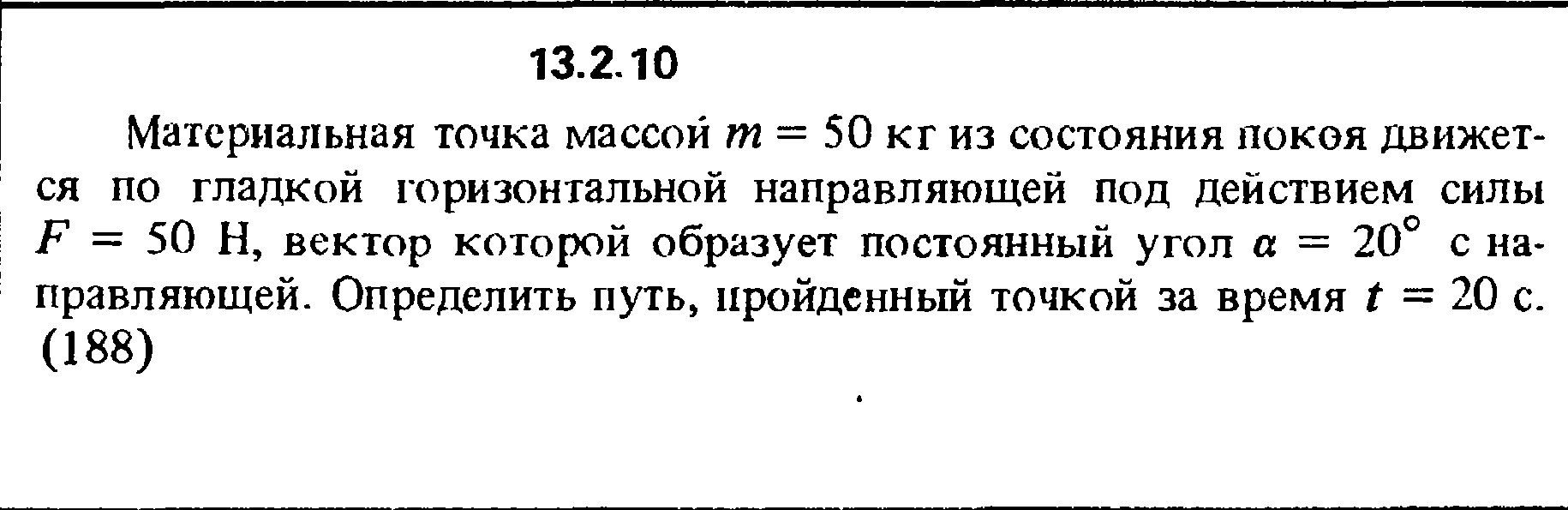 Материальная точка массой m = 50 кг из состояния покоя движется по гладкой горизонтальной направляющей под действием силы F = 50 Н, вектор которой образует постоянный угол α = 20° с направляющей. Определить путь, пройденный точкой за время t = 20 с.