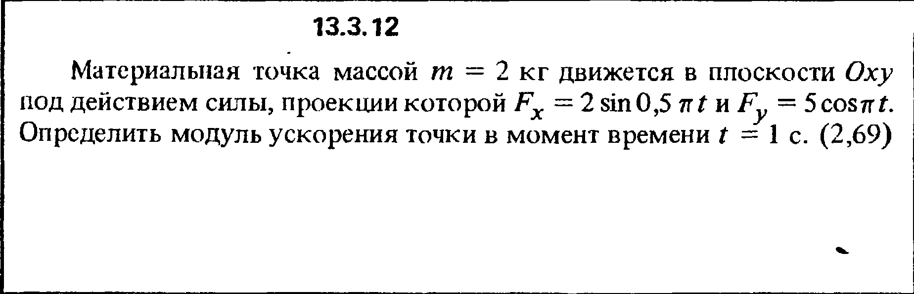 Материальная точка массой m = 2 кг движется в плоскости Оху под действием силы, проекции которой Fx = 2sin0,5πt и Fy= 5 cos&pit. Определить модуль ускорения точки в момент времени t = 1 с.