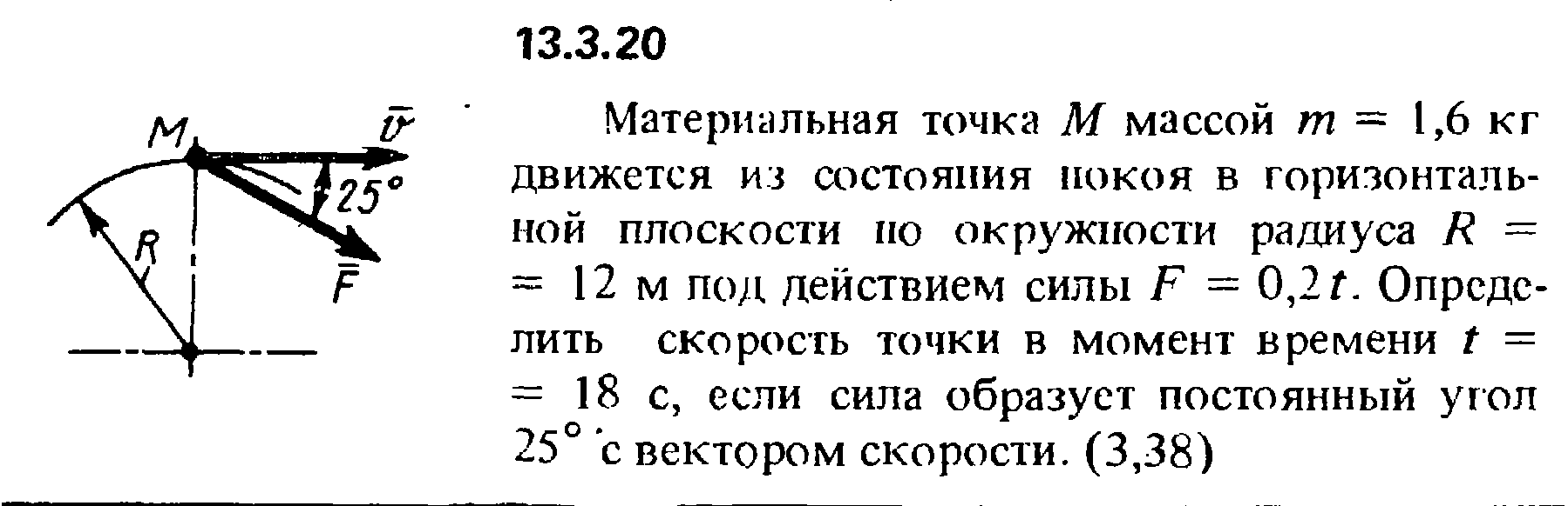 Материальная точка М массой m = 1,6 кг движется из состояния покоя в горизонталь­ной плоскости по окружности радиуса R = 12 м под действием силы F = 0,2t. Определить скорость точки в момент времени t = 18 с, если сила образует постоянный угол 25° с вектором скорости.