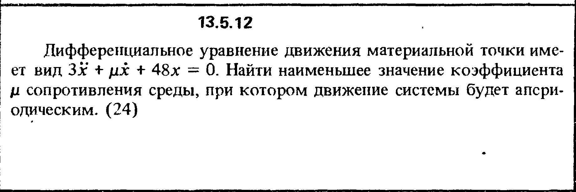 13.5.12. Дифференциальное уравнение движения материальной точки имеет вид 3х + μx + 48х = 0. Найти наименьшее значение коэффициента μ сопротивления среды, при котором движение системы будет апери­одическим.