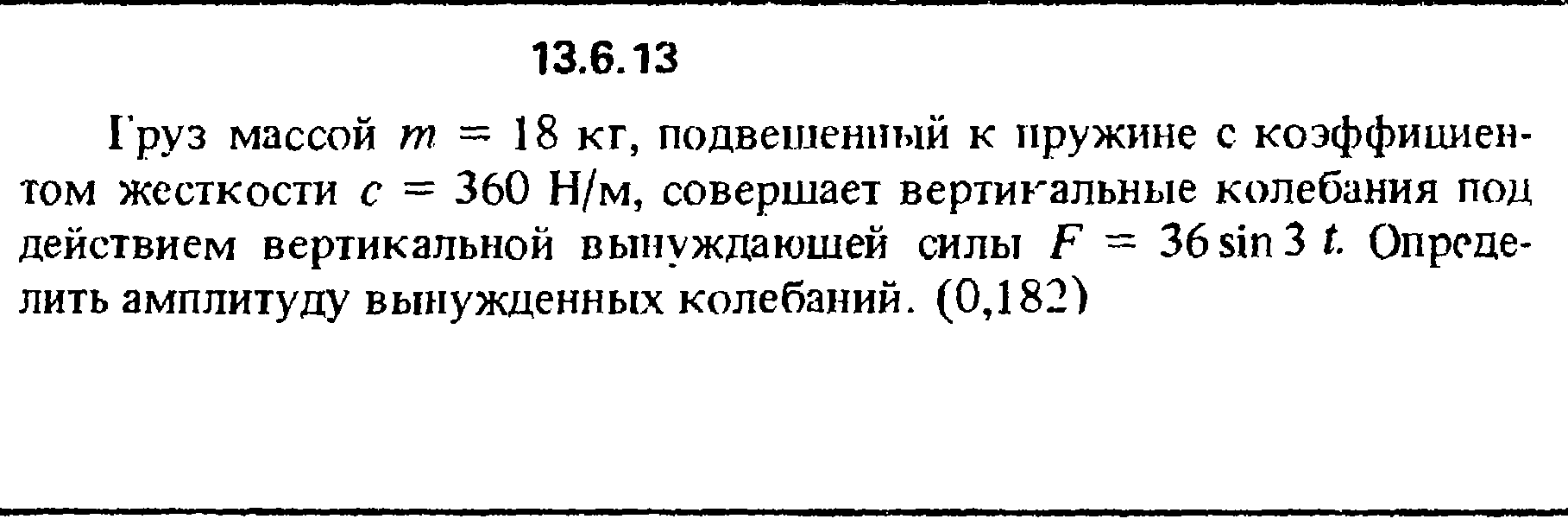 13.6.13. Груз массой m = 18 кг, подвешенный к пружине с коэффициентом жесткости с = 360 Н/м, совершает вертикальные колебания под действием вертикальной вынуждающей силы F = 36sin3t. Определить амплитуду вынужденных колебаний