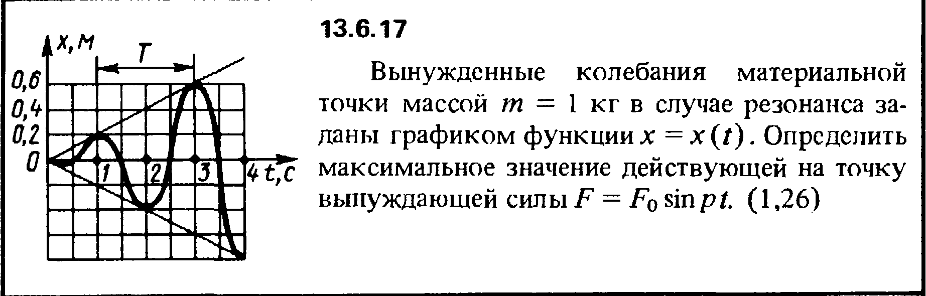 13.6.17. Вынужденные колебания материальной точки массой m = 1 кг в случае резонанса заданы графиком функции х = x(t). Определить максимальное значение действующей на точку вынуждающей силы F = F0sin pt.