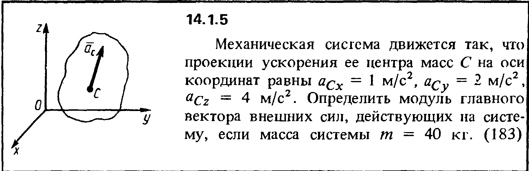 14.1.5. Механическая система движется так, что проекции ускорения ее центра масс С на оси координат равны аСх = 1 м/с2, аСу = 2 м/с2, aCz = 4 м/с2. Определить модуль главного вектора внешних сил, действующих на систему, если масса системы m = 40 кг.