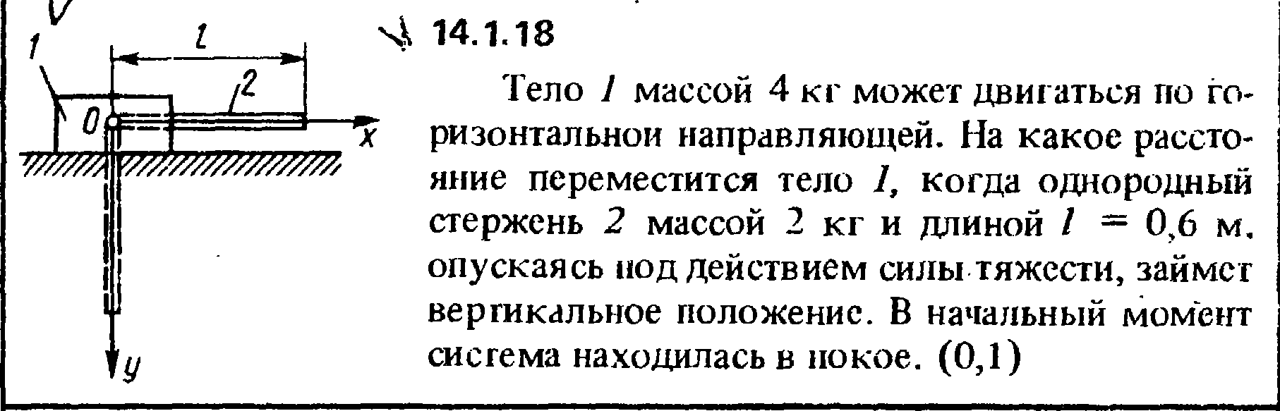14.1.18. Тело 1 массой 4 кг может двигаться по го­ризонтальной направляющей. На какое рассто­яние переместится тело 1, когда однородный стержень 2 массой 2 кг и длиной l = 0,6 м опускаясь под действием силы тяжести, займет вертикальное положение. В начальный момент система находилась в покое.