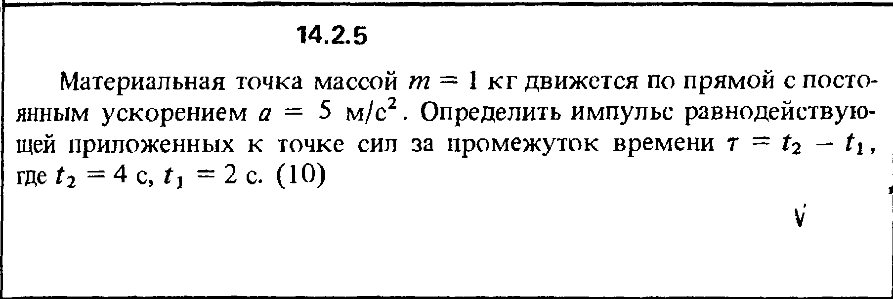 14.2.5. Материальная точка массой m = 1 кг движется по прямой с посто­янным ускорением а = 5 м/с2. Определить импульс равнодействую­щей приложенных к точке сил за промежуток времени τ = t2 - t1, где t2 = 4 с, t1 = 2 с.