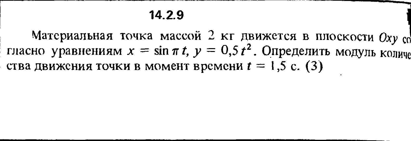 14.2.9. Материальная точка массой 2 кг движется в плоскости Оху coгласно уравнениям х = sinπt, у = 0,5t2. Определить модуль количе­ства движения точки в момент времени t = 1,5 с.