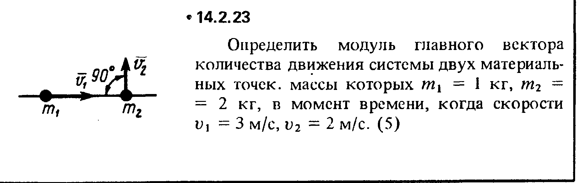 14.2.23. Определить модуль главного вектора количества движения системы двух материаль­ных точек, массы которых m1 = 1 кг, m2 = 2 кг, в момент времени, когда скорости v1 = 3 м/с, v2 = 2 м/с.