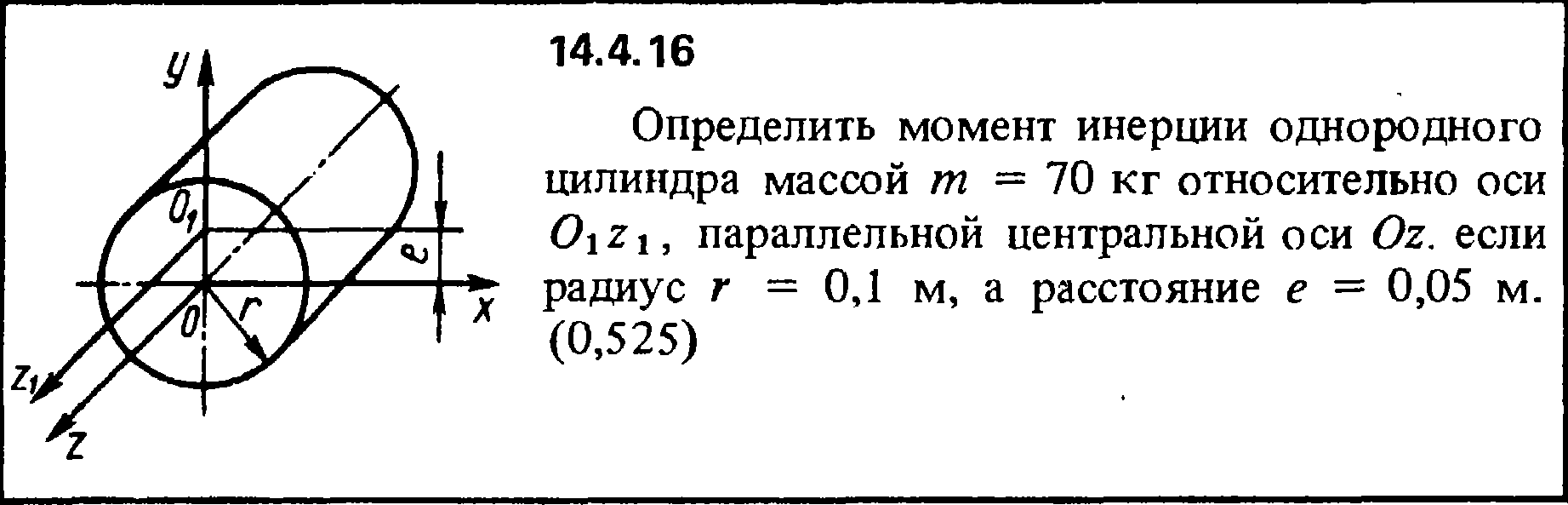 14.4.16. Определить момент инерции однородного цилиндра массой m = 70 кг относительно оси O1z1, параллельной центральной оси Oz, если радиус r = 0,1 м, а расстояние е = 0,05 м.