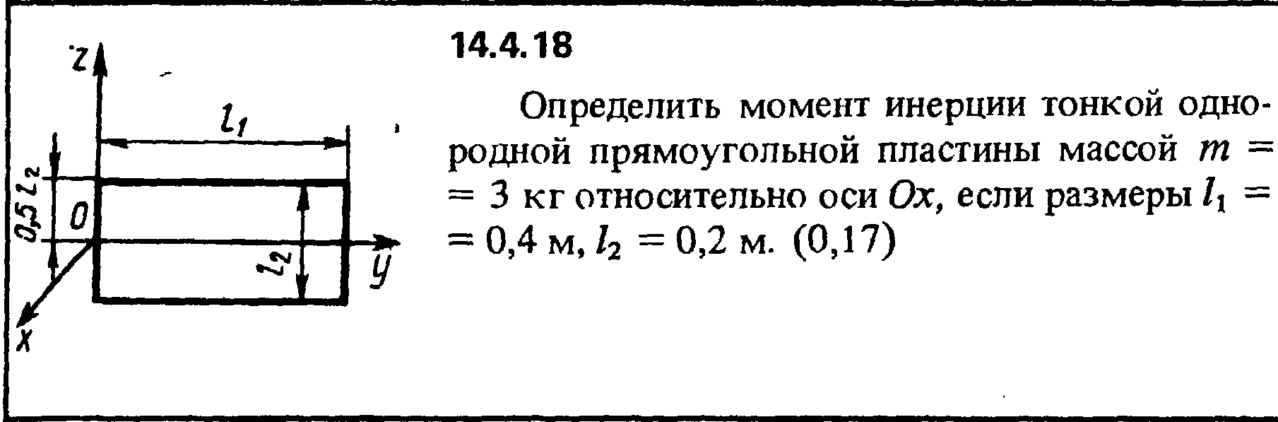 14.4.18. Определить момент инерции тонкой одно­родной прямоугольной пластины массой m = 3 кг относительно оси Ох, если размеры l1 = 0,4 м, l2 = 0,2 м.