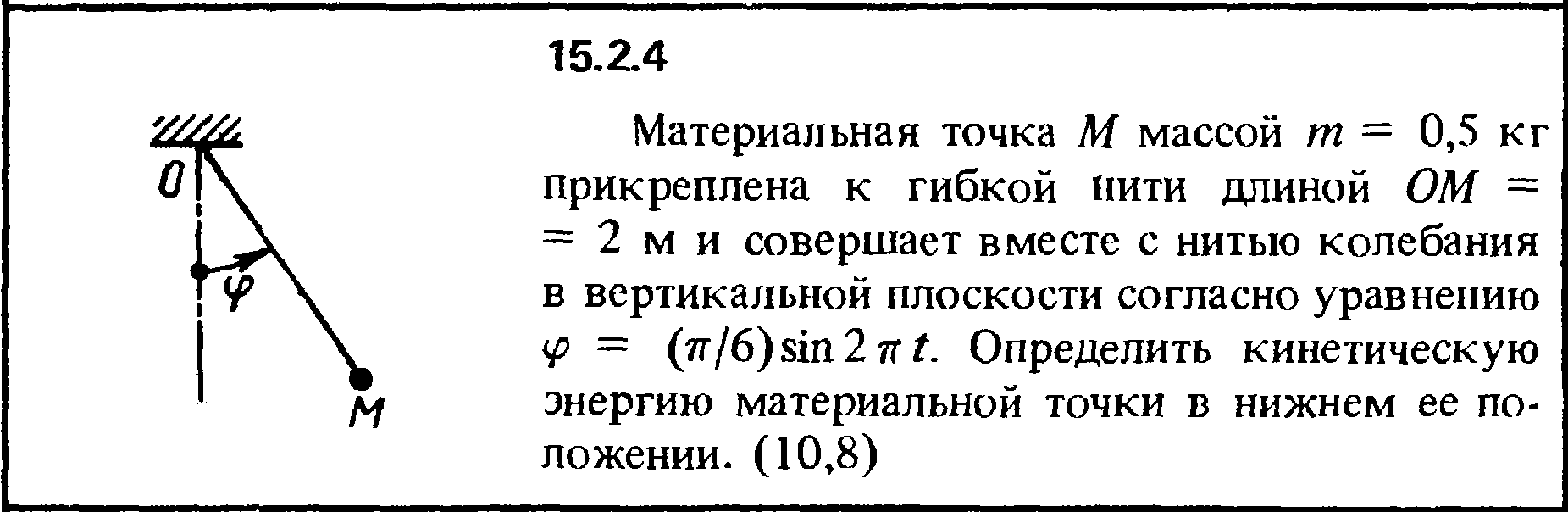 15.2.4. Материальная точка М массой m = 0,5 кг прикреплена к гибкой нити длиной ОМ = 2 м и совершает вместе с нитью колебания в вертикальной плоскости согласно уравнению φ = (π/6)sin2πt. Определить кинетическую энергию материальной точки в нижнем ее по­ложении.