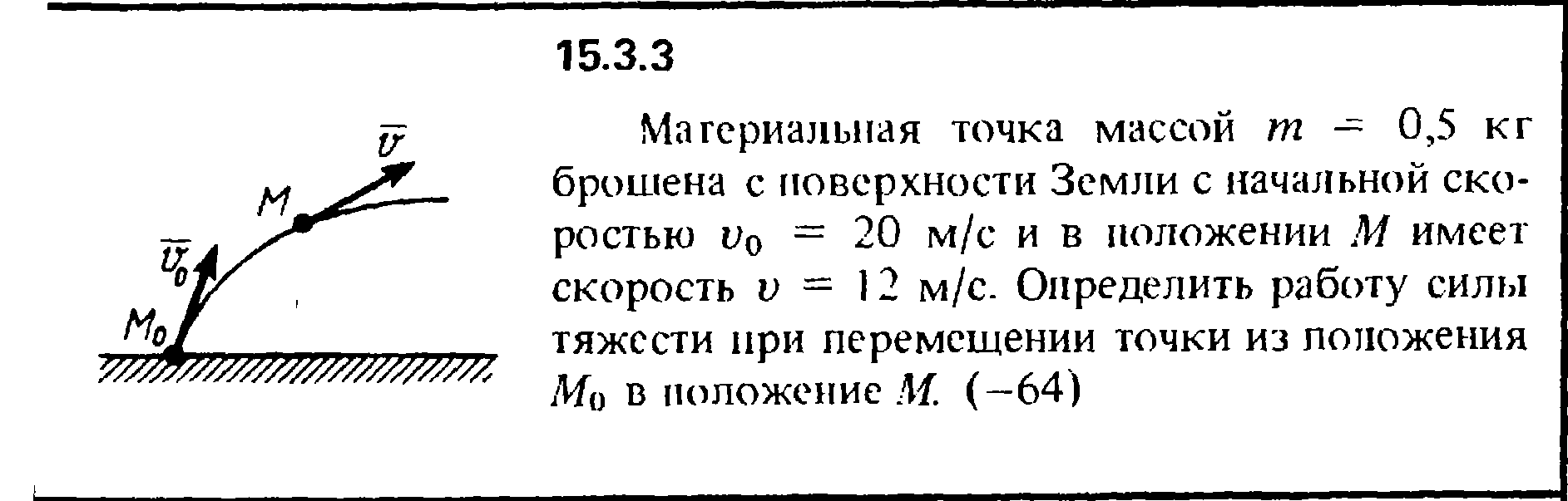 15.3.3.Материальная точка массой m = 0,5 кг брошена с поверхности Земли с начальной ско­ростью v0 = 20 м/с и в положении М имеет скорость v = 12 м/с. Определить работу силы тяжести при перемещении точки из положения М0 в положение М.