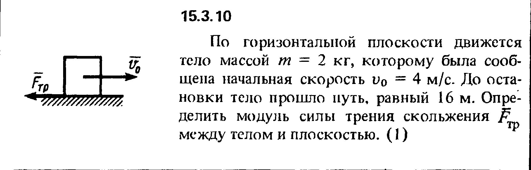 15.3.10. По горизонтальной плоскости движется тело массой m = 2 кг, которому была сооб­щена начальная скорость v0 = 4 м/с. До оста­новки тело прошло путь, равный 16 м. Опре­делить модуль силы трения скольжения между телом и плоскостью.