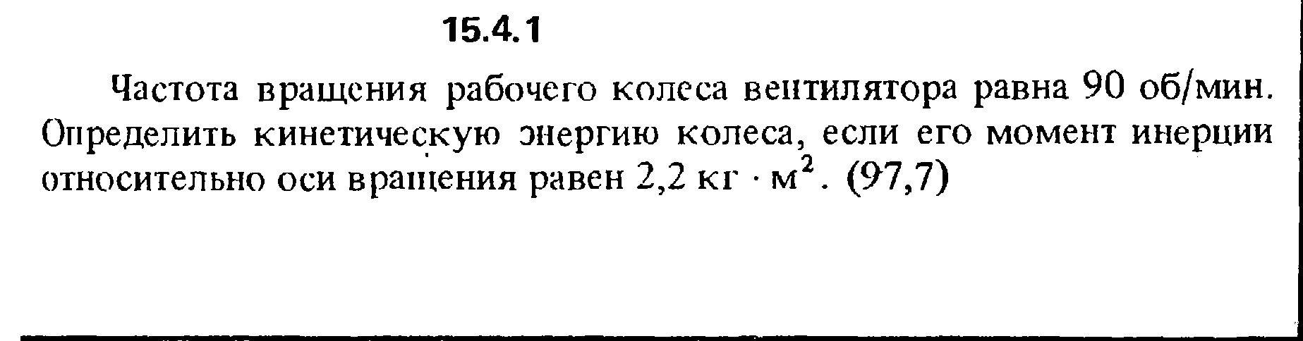15.4.1. Частота вращения рабочего колеса вентилятора равна 90 об/мин. Определить кинетическую энергию колеса, если его момент инерции относительно оси вращения равен 2,2 кг·м2.