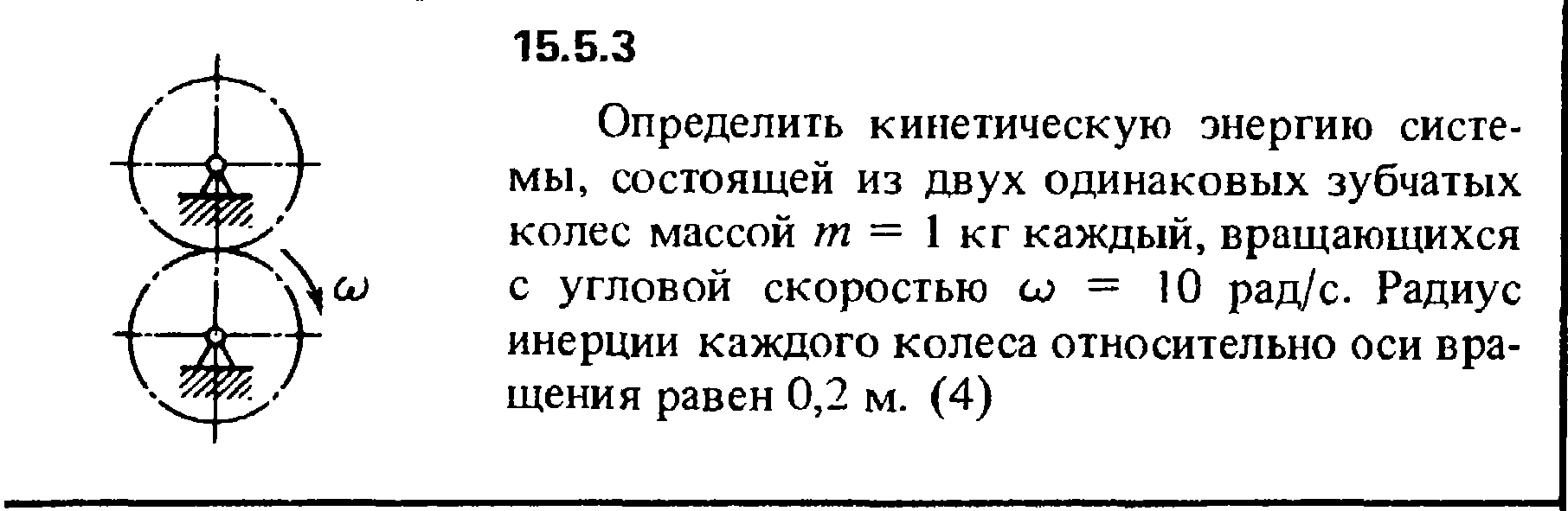 15.5.3. Определить кинетическую энергию системы, состоящей из двух одинаковых зубчатых колес массой m = 1 кг каждый, вращающихся с угловой скоростью ω = 10 рад/с. Радиус инерции каждого колеса относительно оси вращения равен 0,2 м.