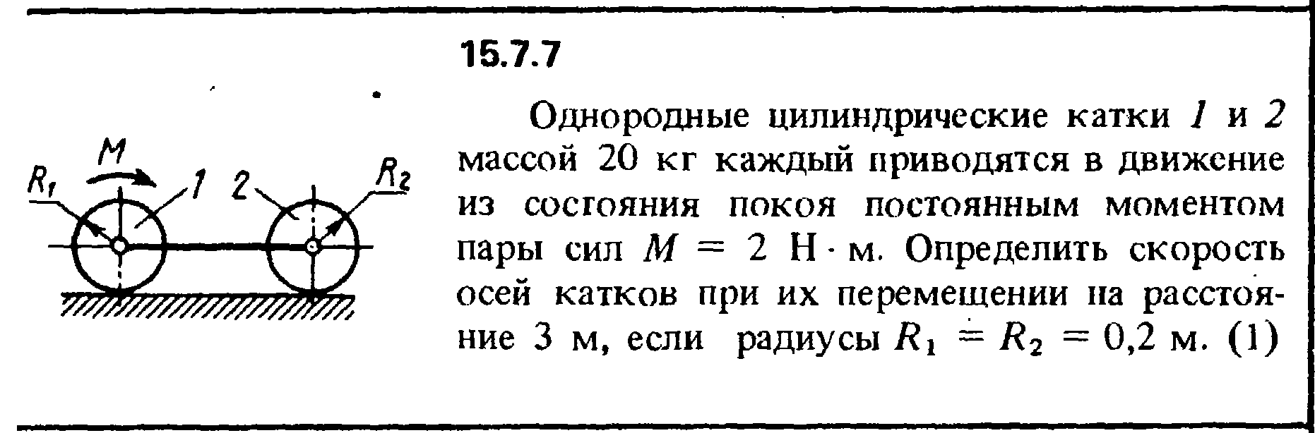 15.7.7. Однородные цилиндрические катки 1 и 2 массой 20 кг каждый приводятся в движение из состояния покоя постоянным моментом пары сил М = 2 Н·м. Определить скорость осей катков при их перемещении на расстоя­ние 3 м, если радиусы R1 = R2 = 0,2 м.